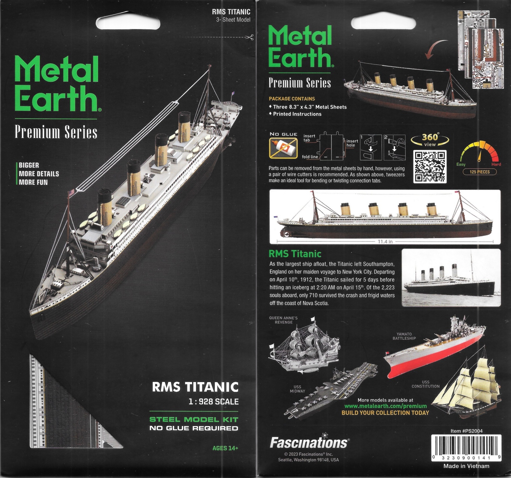 This amazingly detailed model starts as three 8.3″ x 4.3″ metal sheets and finishes as a 3-D model. It is approximately 11.4″ L x 1.2″ W x 3.25″ H when assembled and this one features the ill fated ocean liner RMS Titanic. As the largest ship afloat, the Titanic left Southampton, England on her maiden voyage to New York City. Departing on April 10th, 1912, the Titanic sailed for 5 days before hitting an iceberg at 2:20 AM on April 15th. Of the 2,223 souls aboard, only 710 survived the crash and frigid waters off the coast of Nova Scotia. The sheets contains detailed laser etching for easy removal. Complete instructions are included to show you how to pop out the pieces, bend the tabs, and connect them at the attachment points. This kit is considered challenging with an average assembly time of 60-90 minutes. It has been stored in a smoke and pet free environment. We also offer an optional LED base or a Solar Spinner for better display of your model.