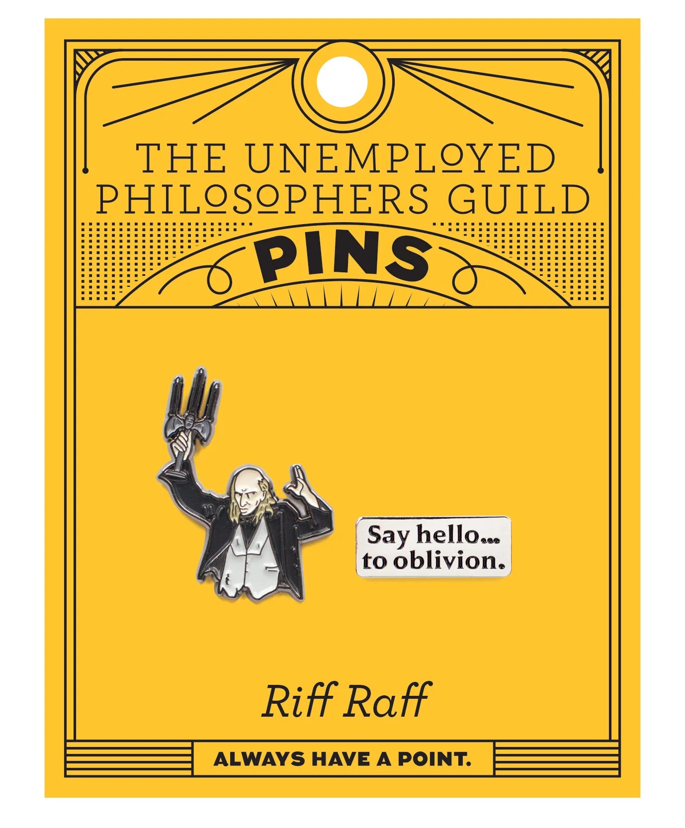 Say goodbye to all of this. This is part of a new collection of bold and boa’d, outrageous, officially-licensed Rocky Horror Show Enamel Pins. The underground phenomenon became the musical that goes on and on – and recently celebrated its 50th anniversary of continuous TIME WARP! Here they are… fan-favorite characters paired with iconic quotes – and the TIME WARP. And a good thing it is, too, because everybody looks good in fishnets… everyone. I’m lucky, you’re lucky, we’re all lucky! Riff Raff is 1.5″ high and the phrase pin is 1″ wide. New and unused they are stored in a smoke and pet free environment.