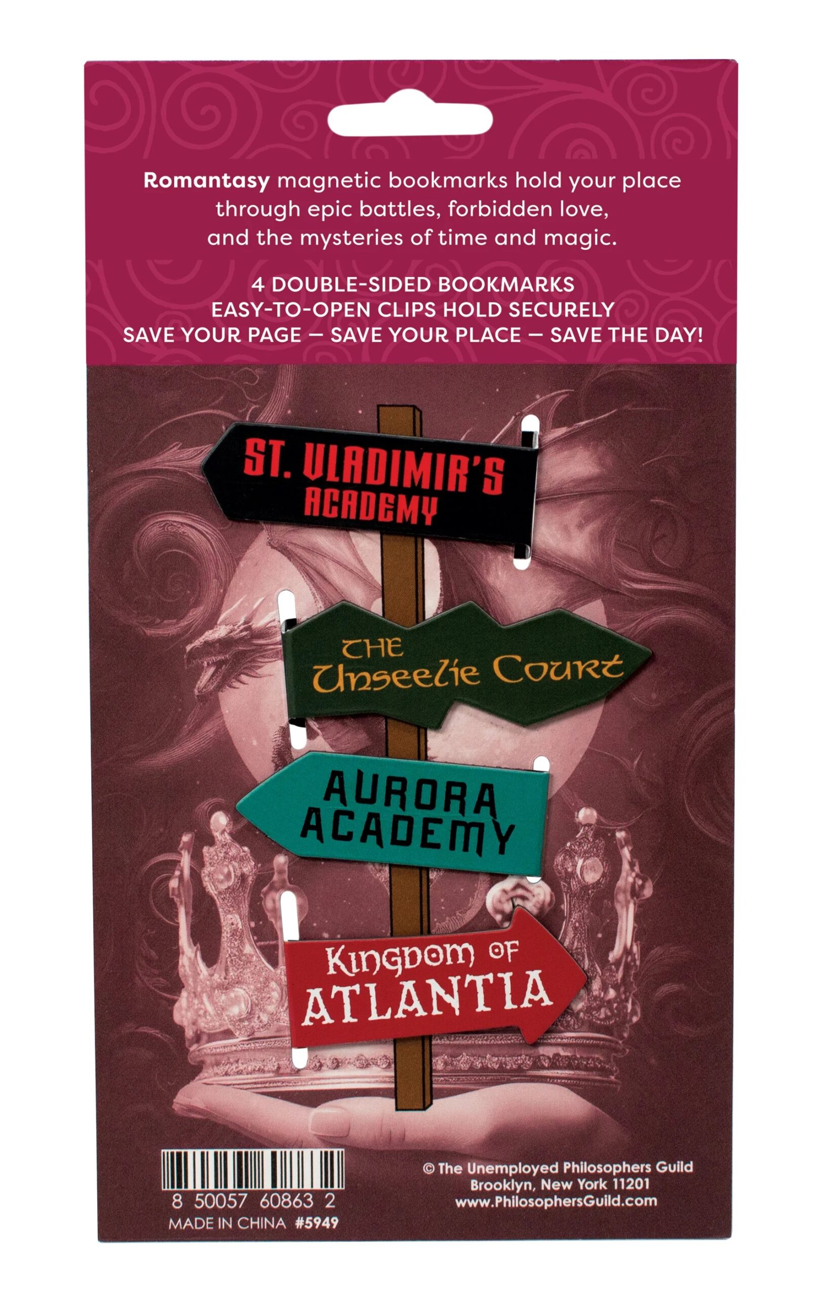 Fated mates. Forbidden magic. Danger lurking in the shadows. Welcome to the world of Romantasy, where your heart races just as fast as you turn the page. Each magnetic bookmark is inspired by the drama, danger, and dreamy chaos of the Romantasy genre. Whether you’re hiding in the woods with your enemies-to-lovers crush, negotiating peace with a morally gray fae prince, or riding dragons into battle – you’ll never lose your place in the story. These bookmarks cling to your pages like a death grip from a possessive hero (you know the type). Now you’ll never get lost – not even when you’re lost in a good book. These Literary Places Magnetic Bookmarks hold your place until you can hold off everything else. Powered by lo-tech, easy-to-operate, hinge technology more than 3,625 years old, each Bookmark features two signs held together by a bendy bit – so there’s an eye-catching image on either side of the page! This is a new, unused magnet set sealed in its original package and stored in a smoke and pet free environment.