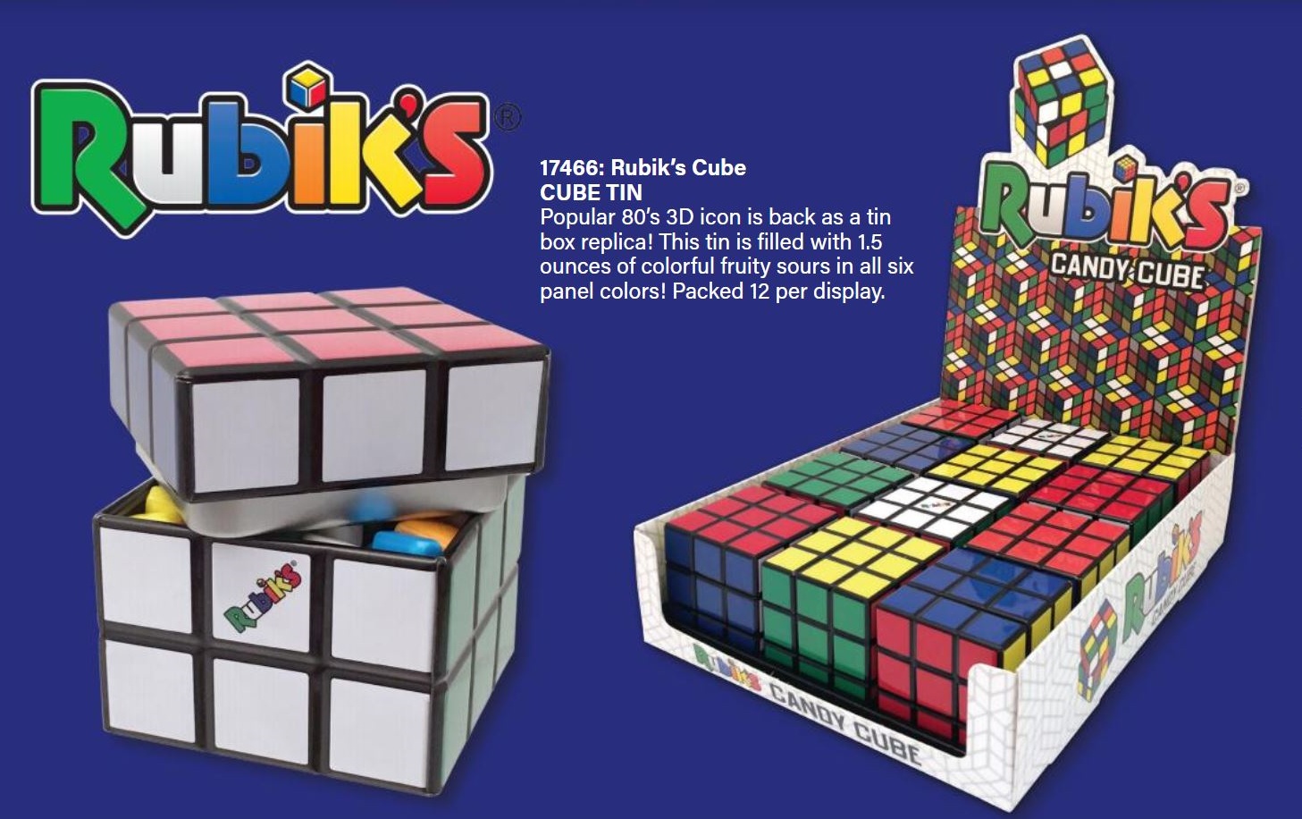 The popular 80’s 3D icon is back as a tin box replica! This tin is filled with colorful fruity sours in the panel colors. Each tin measures 2″ square. Just twist a section and it opens to reveal the candy inside. This is a new, never opened box of 12 tins of candy stored in a smoke and pet free environment.