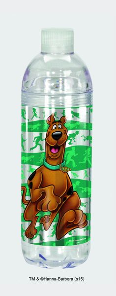 This is a new and unused light grey and clear, twist open, 24 ounce acrylic water bottle featuring the animated art figure of Scooby running from the Scooby-Doo cartoons. The top portion twists off for easy cleaning or to add ice and there is a plastic loop to attach it to a backpack or belt. It is stored in a smoke and pet free environment.