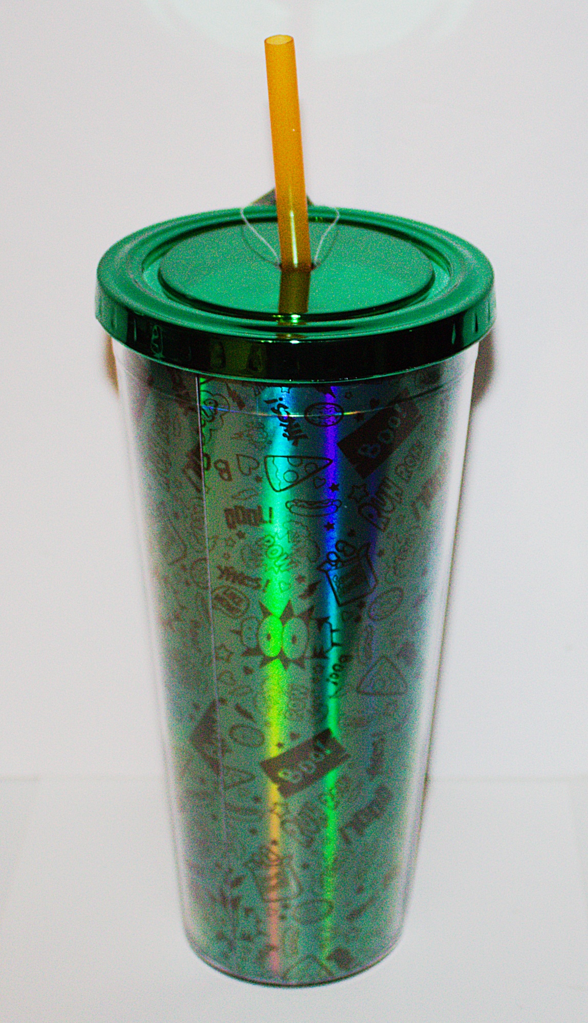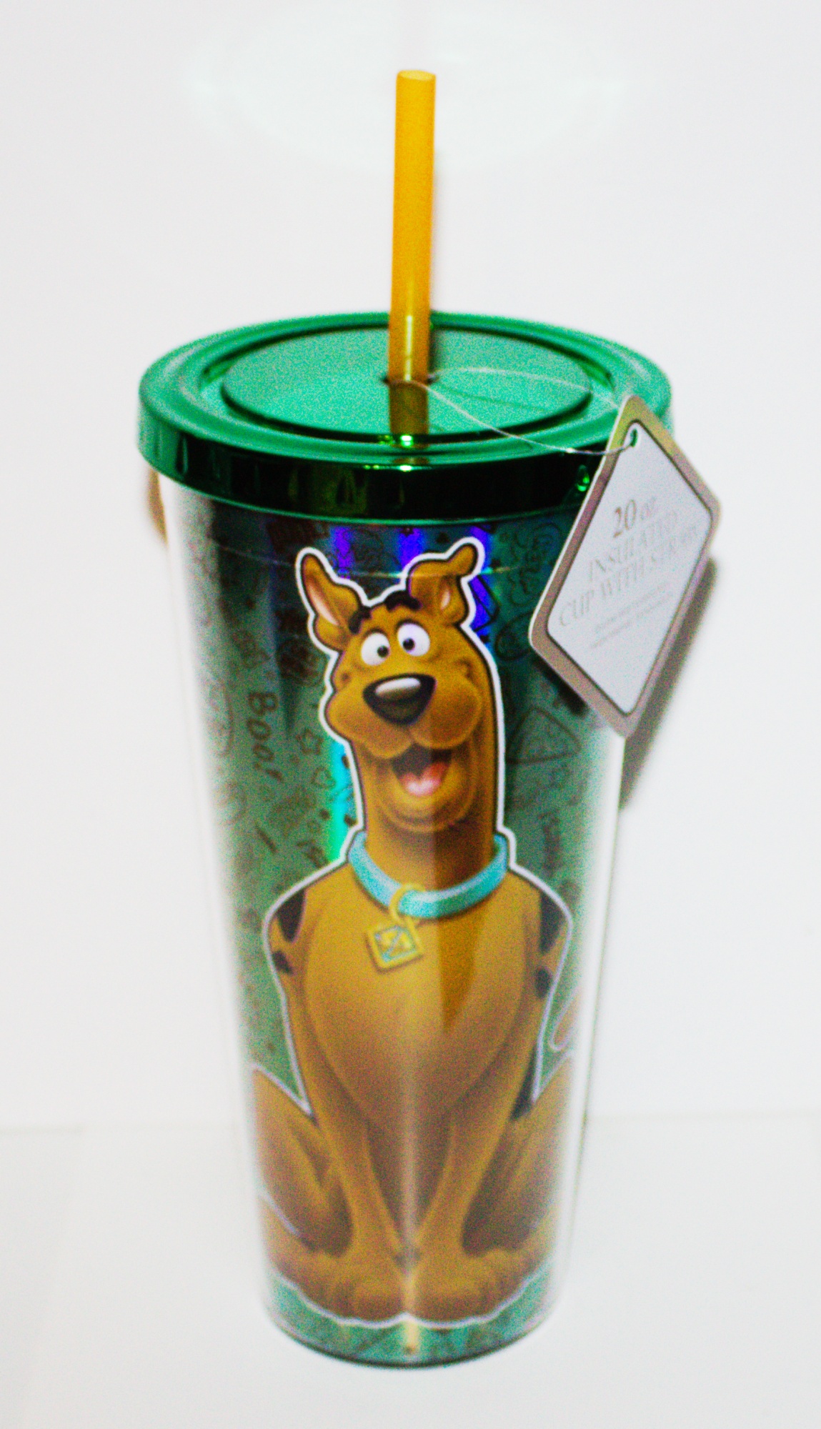 This is a 20 ounce foil travel cup with a straw featuring the smiling figure of Scooby-Doo! from the Hanna-Barbera cartoons. It comes in a protective box and is a new, unused cup stored in a smoke and pet free environment.