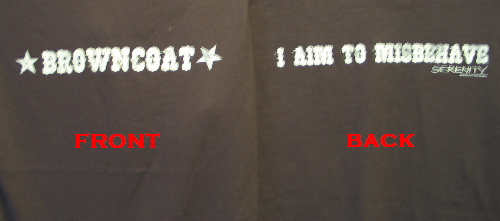 This is a licensed brown t-shirt featuring the word browncoat on the front and the phrase “I Aim To Misbehave” on the back, from the hit movie Serenity, which is based on the cult favorite TV series Firefly. This is a new, never worn t-shirt that has been stored in a smoke and pet free environment.