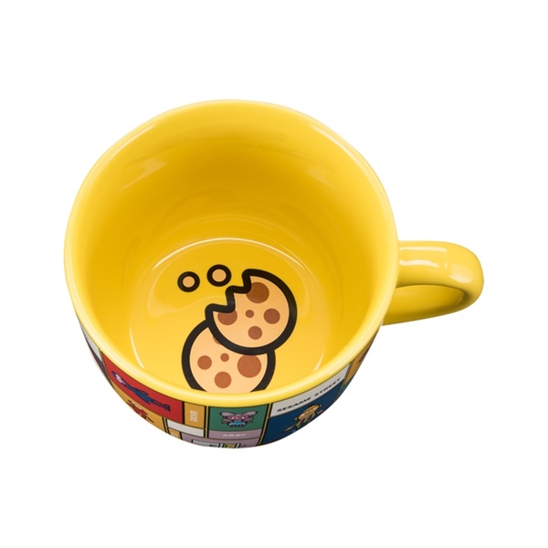 This is a 20 oz. ceramic soup mug featuring art images and names of the characters from Sesame Street in a wrap-around design. The bottom inside of the mug has the image of partially eaten cookies. It is new and unused and is stored in a smoke and pet free environment.