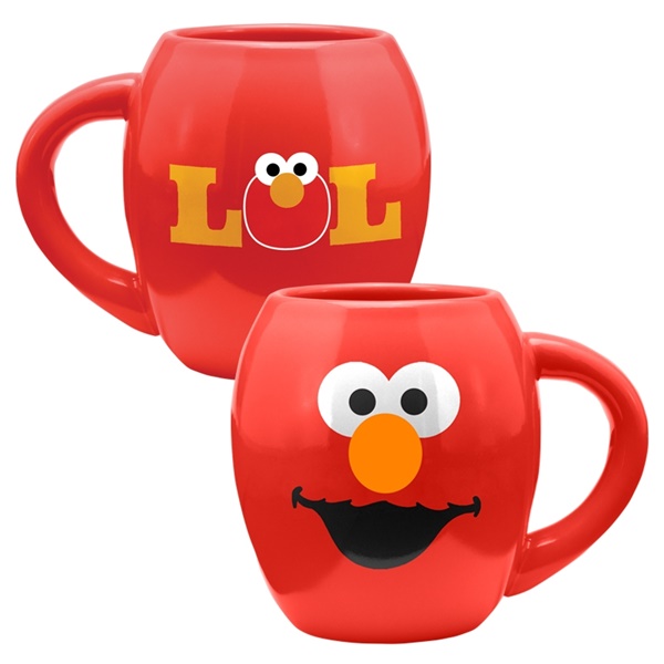 This is an illustrated red 18 ounce oval ceramic mug featuring the art of the face of Elmo on the front from the long running children’s TV show Sesame Street. It is a new and unused licensed mug packed in a protective box and stored in a smoke and pet free environment.