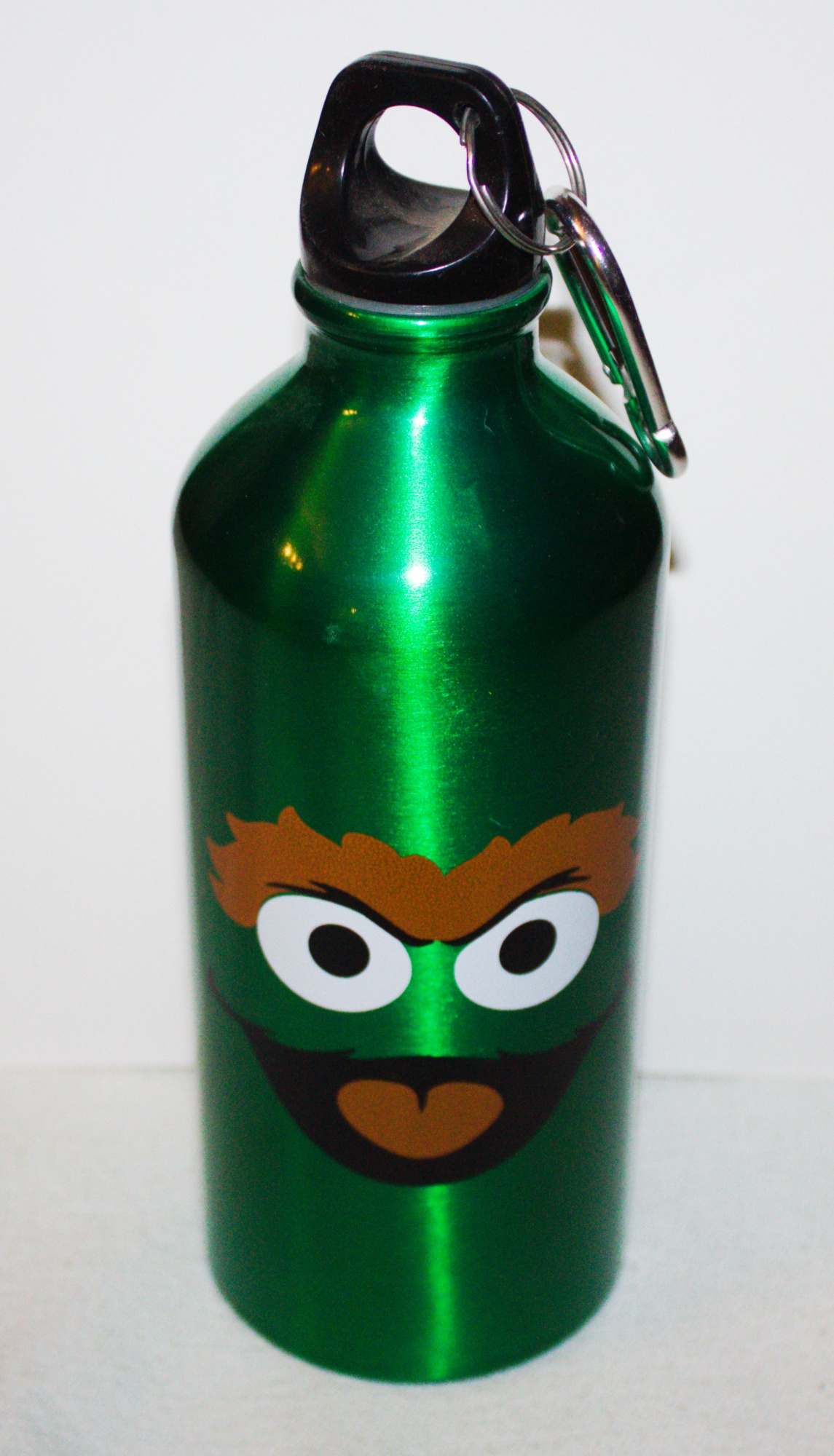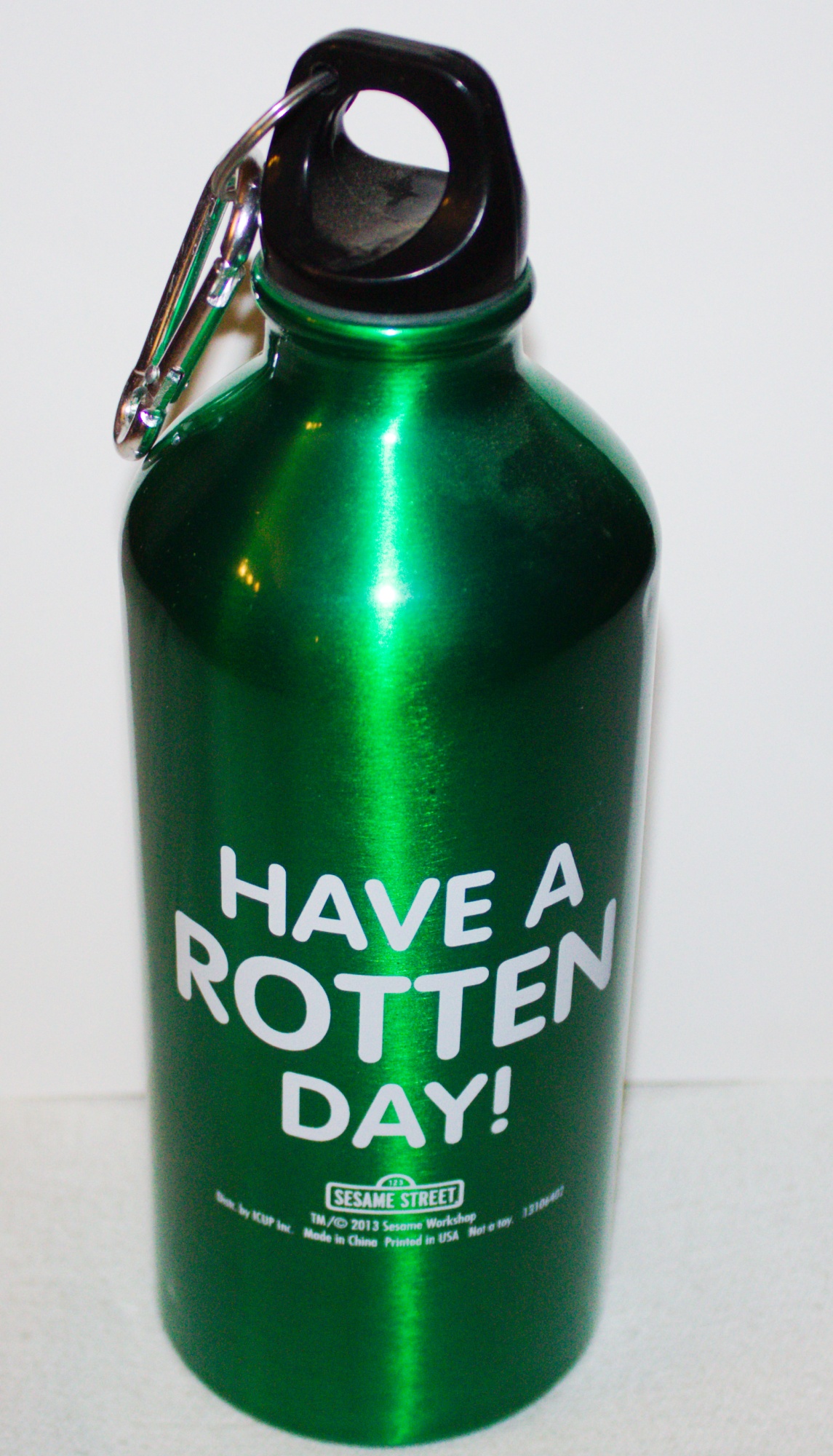 This is a 24 oz. aluminum travel water bottle that features the eyes of Oscar the Grouch from Sesame Street. On the back it has his phrase “Have A Rotten Day”. it comes with a screw on top with a carbineer attached so that you can attach this to a backpack or your belt. It is new and unused and is stored in a smoke and pet free environment.