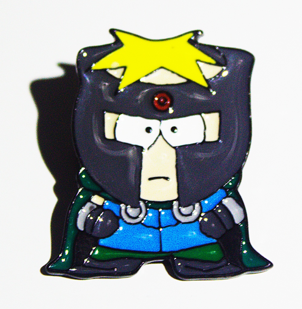 This is a 1.375″ high metal enamel lapel pin which depicts the standing image of Butters Stotch as his alter ego of Professor Chaos as seen on the hit animated TV series South Park. This is a mint, unused pin stored in a smoke and pet free environment.