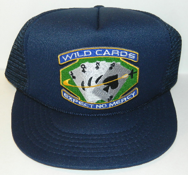 This is a BLUE cloth adjustable baseball style (meaning a round bill) hat (made of 65% polyester and 35% cotton) with a 100% polyester mesh back and an embroidered patch on the front. This patch of the Wild Cards is our most popular logo of the now cult sci-fi TV series, `Space Above And Beyond’. It is a patch measuring 3″ x 3 3/4″ across. This is a new, never worn hat stored in a smoke and pet free environment.