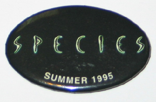 This is a licensed photo button produced in 1995 to promote the release of the original Species movie. It features the name logo with a green tint above the release date. It is a new, unused oval button, measuring 2.75″ wide.