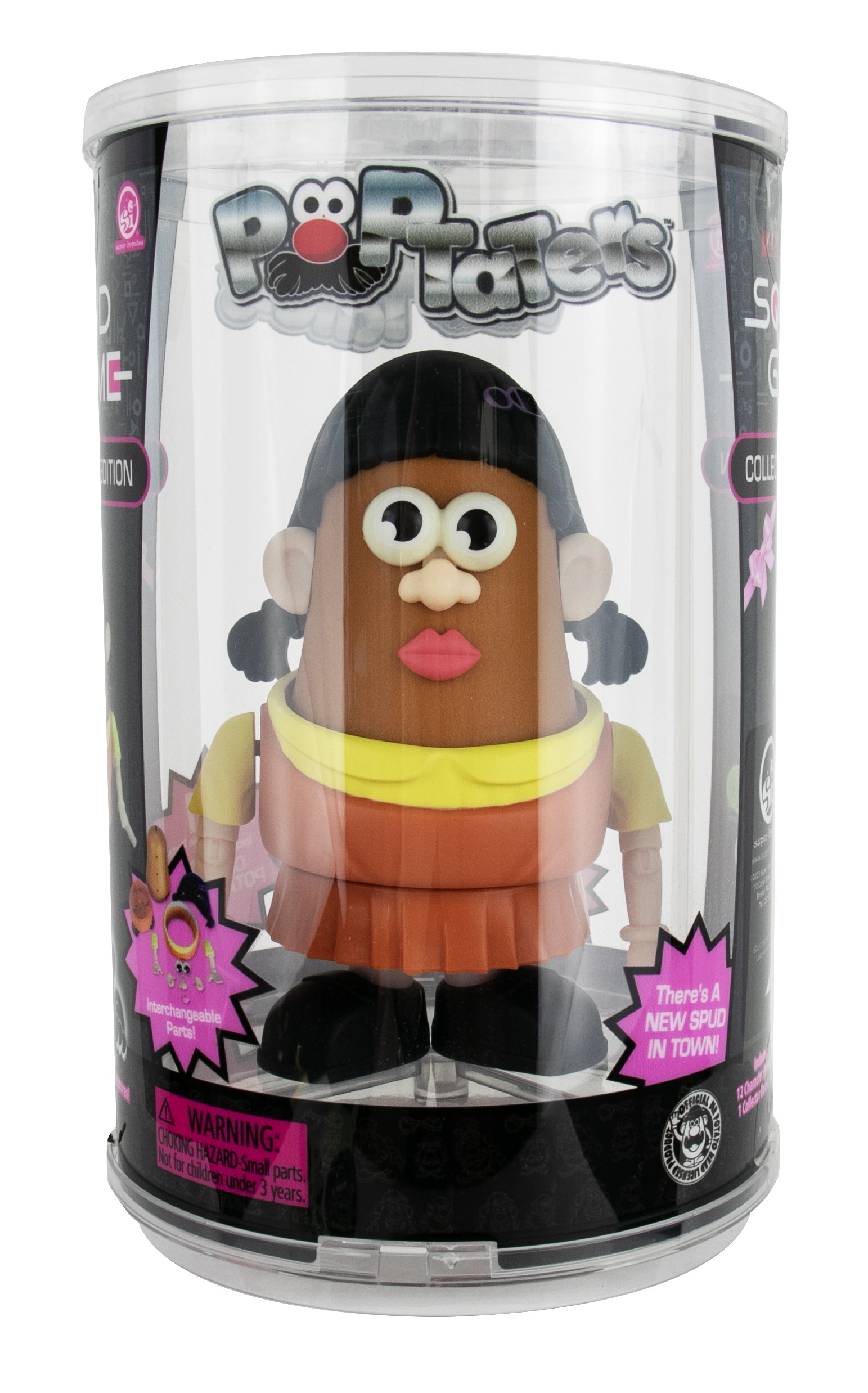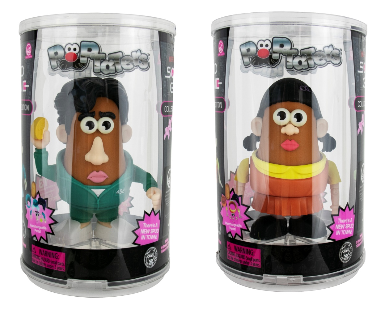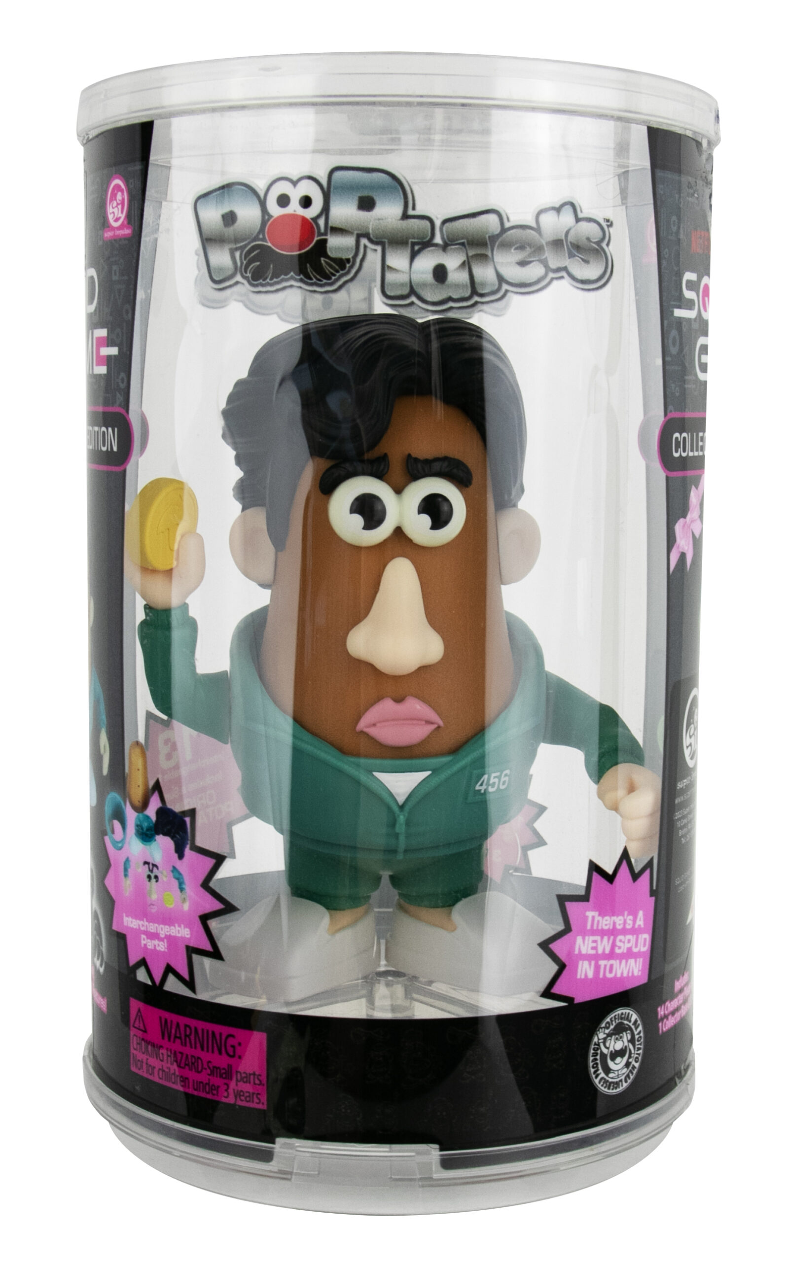 Produced by Super Impulse, this is part of their Poptaters lines of toys and features the boy and girl Player 456 & Young-Hee from the popular Squid Game TV series. Poptaters Player 456 & Young-Hee are the ultimate fan mashup combining the iconic Potato Head with pop culture icons, creating hilarious, fun collectibles! This includes 12 removable, interchangeable facial and body parts for each including one surprise Potato Head original piece! The 4″ body nearly doubles in size when accessories are on. Purchased new by us from the manufacturer, it is stored in a smoke and pet free environment.