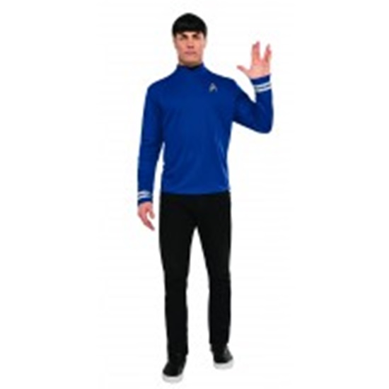 This is a licensed deluxe blue uniform shirt as seen and worn in the new Star Trek Beyond movie. This color would have been worn by Spock. This is a new, unworn sealed copy from our files. . It is stored in a smoke and pet free environment. We sell the authentic metal pips and communicator pin separately.