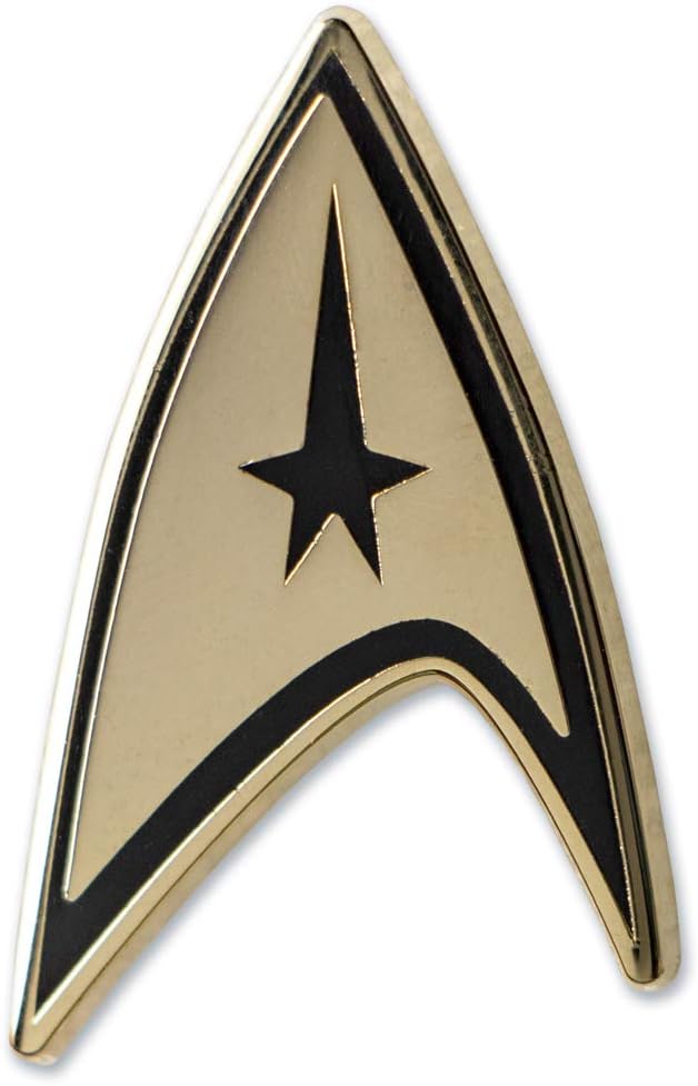This is a beautiful bright gold tone metal enamel pin featuring the classic Star Trek command logo in black, as seen on the chest of Captain Kirk in the original TV series. This is a mini-version that measures 1.125″ high x .75″ wide at the base and is a new unused condition pin made by Ata-Boy and stored in a smoke and pet free environment.
