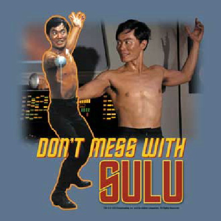 This is a slate blue t-shirt bearing a collage of images of Sulu swordfighting from a classic Star Trek TV series episode. This is a new, unworn t-shirt. It has been stored in a smoke and pet free environment.