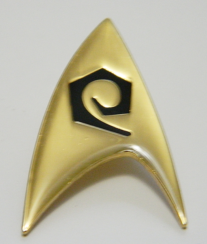 This is a beautiful gold tone cloisonne pin featuring the classic Star Trek engineering logo, as seen on the chest of Commander Scott and Lt. Uhura in the original TV series. It measures 1.625″ high and is a new, unused, mint condition pin made by the Hollywood Pins Company. It has had limited release and is not easily found outside of Star Trek conventions. Hollywood Pins closed down in October 2001 so this pin will soon be next to impossible to find. It has been stored in a smoke and pet free environment.