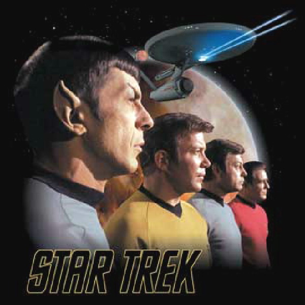 This is a black t-shirt bearing the images Spock, Kirk, McCoy, and Scotty looking forward with the USS Enterprise and a planet in the background, from the Classic Star Trek TV series. This is a new, unworn t-shirt. It has been stored in a smoke and pet free environment.