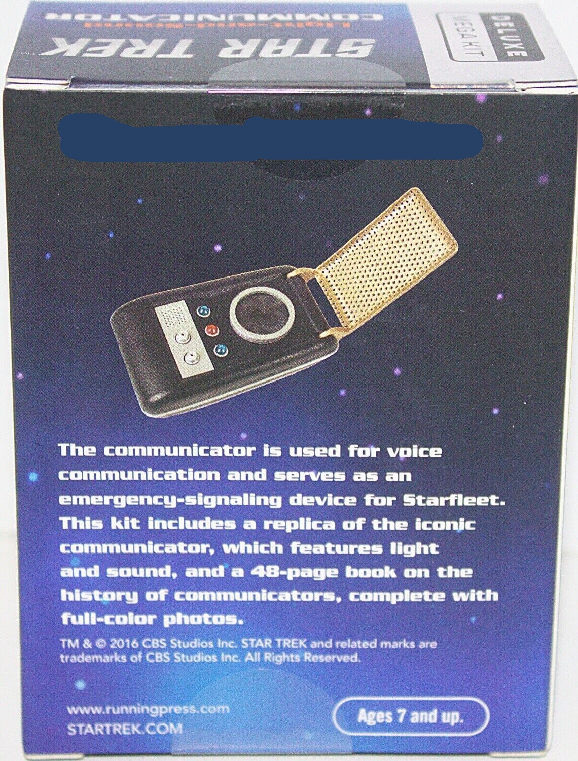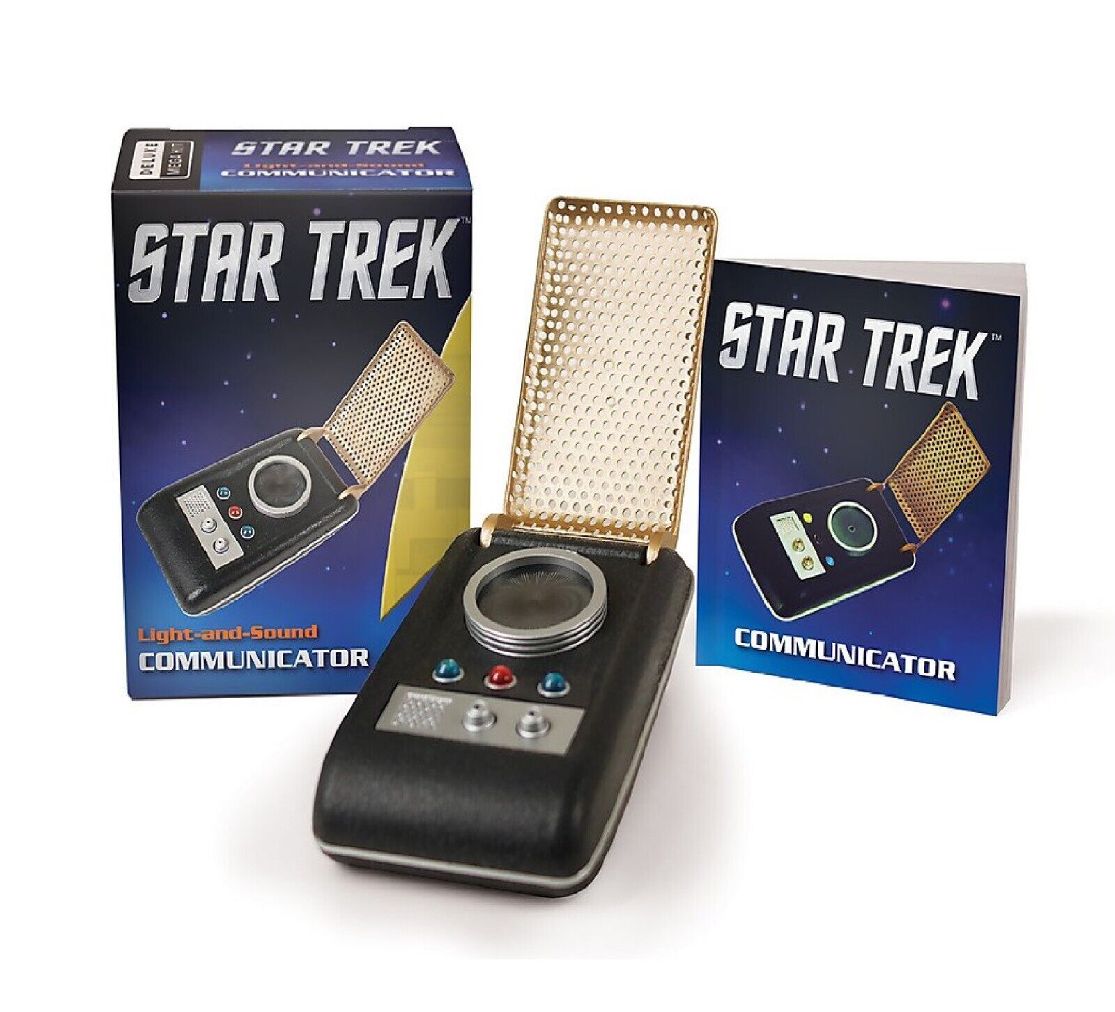 This is one of a series of mini books about Star Trek that comes with a Star Trek model or toy. Star Trek fans and collectors will love this one-of-a-kind, mini-size collectible communicator with light and sound. The communicator is used for voice communication and serves as an emergency-signaling device for Starfleet. This kit includes a replica of the iconic communicator, with light and sound, and a 48-page book on the history of communicators, complete with full-color photos. This is a new, sealed copy that we purchased direct from the publisher and it has been stored in a smoke and pet free environment.