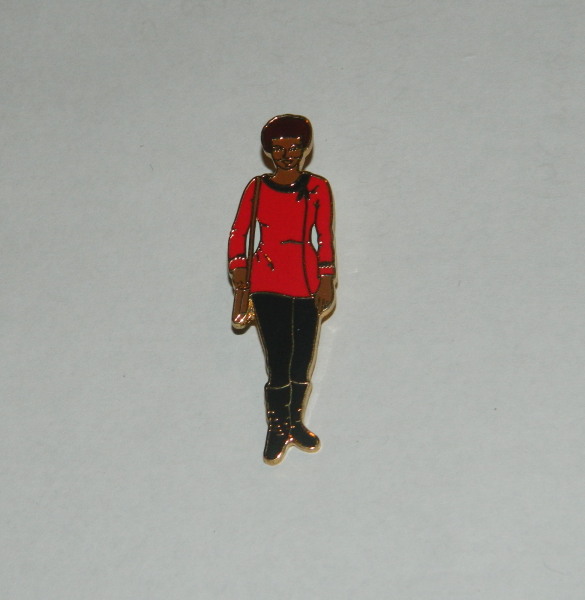 This cloisonne pin features the cut-out image of the classic Lt. Uhura as seen on TV’s Star Trek Original Series. It measures 2 1/4″ high and is a mint, unworn pin, long out of production, made by the Hollywood Pins Company. It has had limited release and is not easily found outside of Star Trek conventions. Hollywood Pins closed down in October 2001 so this pin will soon be next to impossible to find. It has been stored in a smoke and pet free environment.