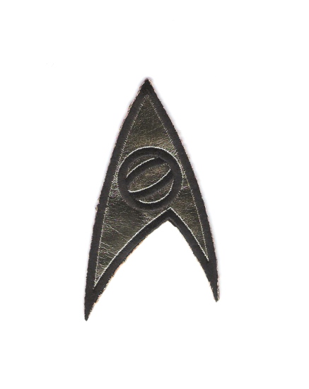 This mint patch pictures the science chevron as seen on the episodes of classic Star Trek. It was worn on the left breast of the shirts, as worn by Dr. McCoy and Mr. Spock. It measures 3 .5″ high. Originally made by Majel Barrett Roddenberry’s company, these have always been difficult to find outside of Star Trek conventions, and have been totally unavailable for many years. It has a glue backing for easy application to any cloth surface and has been stored in a smoke and pet free environment.