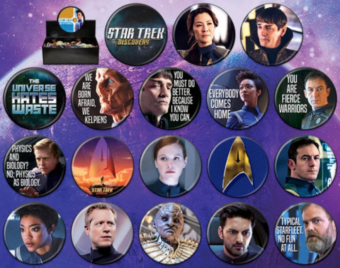Produced by ATA-BOY, this is a licensed set of 144, 1.25″ wide metal buttons featuring multiple photo images and phrases from the Star Trek Discovery TV series. This is a new, never used, assortment that comes in an illustrated display box and is stored in a smoke and pet free environment.