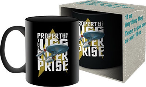 This is an 11 ounce, black, ceramic mug from the hit series Star Trek bearing an image of the USS Enterprise with the phrase “Property of the USS Enterprise” behind it. This is a new, never used mug pulled straight from the case it came in when we bought them, and stored in a smoke and pet free environment.