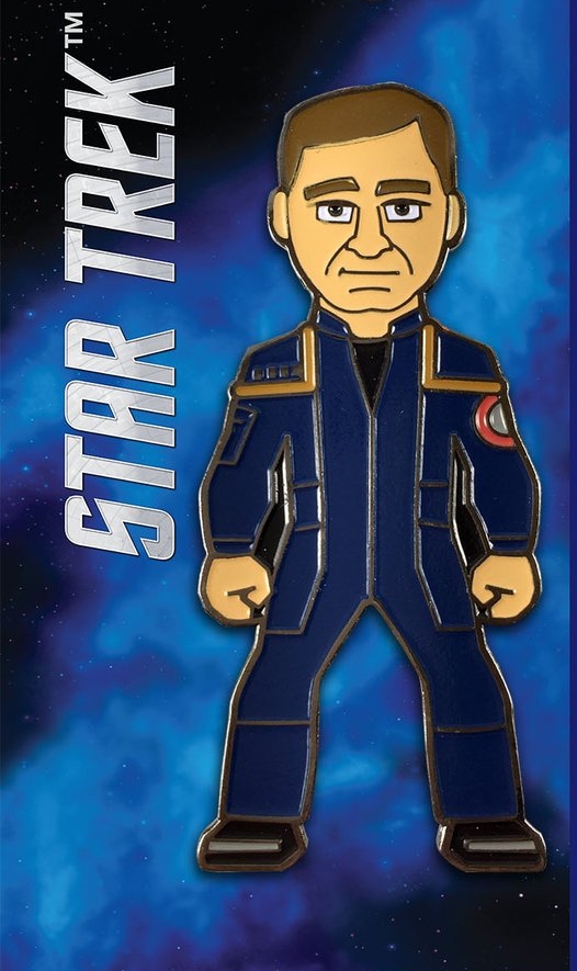 This 2″ tall enamel metal pin features the standing image of the Captain Archer from the Star Trek Enterprise TV series. This is a mint, never used licensed pin that comes in a s sealed package with a header card. This pin is not easily found outside of Star Trek conventions due to low distribution. It is stored in a smoke and pet free environment.