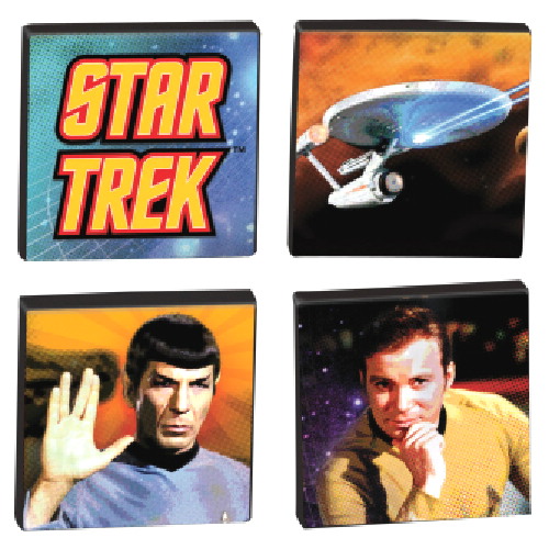 This is 2″ x 2″ x 1/4″ thick set of four magnets from the classic Star Trek TV series. They feature the full-color images of the classic Kirk, Spock and Enterprise along with the classic name on the front. It is a new, unused set that comes shrinkwrapped. It has been stored in a smoke and pet free environment.