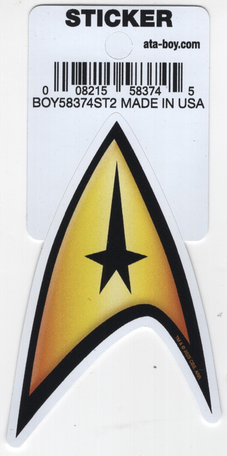 This is a 3.25″ high (approximate) sticker decal that features theimage of the command insignia from the original classic Star Trek TV series. This is a new, unused sticker with an easy front peel off removal that is stored in a smoke and pet free environment.