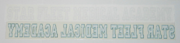 This is a white and green window decal featuring the phrase “Star Fleet Medical Academy” as seen in the Star Trek movies and TV shows. New and unused, it is a peel-off decal measuring 2″ x 18.25″. This is stored in a smoke and pet free environment.