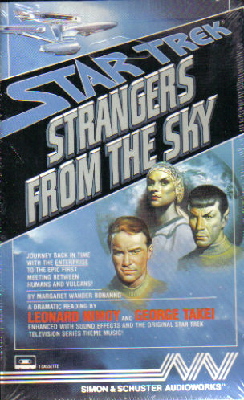 This is a cassette tape read by Leonard Nimoy (Mr. Spock) and George Takei (Sulu), of the novel Strangers From The Sky written by Margaret Wander Bonanno. Released in 1987, this 90 minute long storytelling is a mint, never played, still in the original shrinkwrap copy from our files stored in a smoke and pet free environment.
