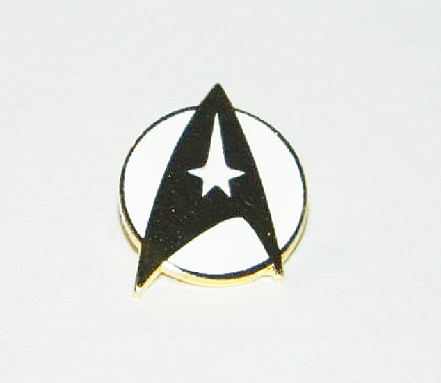 This is a beautiful gold tone and white cloisonne metal pin features the classic command logo as seen in Star Trek: The Motion Picture. This is a pin representation of the patches worn in the movie with white standing for executive command, yellow for operations, orange for science, red for engineering, green for medical and blue for security. It measures approximately .625″ x .875″ and is a new, unused, mint condition pin made by the Hollywood Pins Company. It has had limited release, produced in the 1980’s, and is not easily found outside of Star Trek conventions. Hollywood Pins closed down in October 2001 so this pin is next to impossible to find. It has been stored in a smoke and pet free environment.