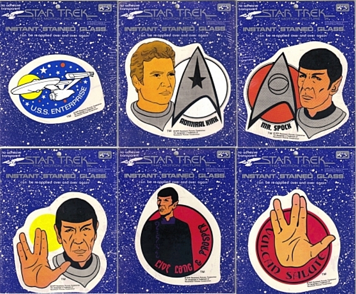 Released in 1979 by the Aviva company for the release of Star Trek: The Motion Picture, this is a set of 6 different stained glass transfers with images of the Enterprise, Kirk and Spock. They are transparent with no adhesive and can be re-applied over and over again. Long out of print, these are mint, unused, original shrink wrap copies. Each card measures 8″ x 6.5″ with the actual decal measuring around 5.25″ to 5.75″ wide.