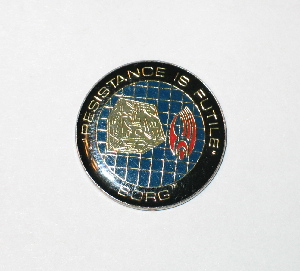 This pin features the image of the Borg Cube ship and the Borg logo, surrounded by the words “Resistance is Futile”, as first seen on Star Trek: The Next Generation. It measures 1 1/4″ wide and is a new, unused, mint condition enamel pin made by the Hollywood Pins Company. It had limited release and is not easily found outside of Star Trek conventions. Hollywood Pins closed down in October 2001 so this pin will soon be next to impossible to find. It has been stored in a smoke and pet free environment.