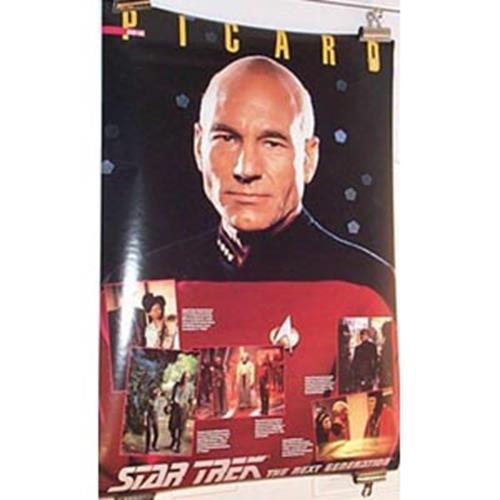This 27 x 35 poster pictures the captain of the U.S.S. Enterprise NCC 1701-D, Captain Picard, as seen on the hit TV series Star Trek: The Next Generation. It also includes a collage of scenes from various episodes. Printed in 1992 by Portal Publications, and long out of print, it is a new poster, in near mint shape from our files, and comes rolled. It has been stored in a smoke and pet free environment.