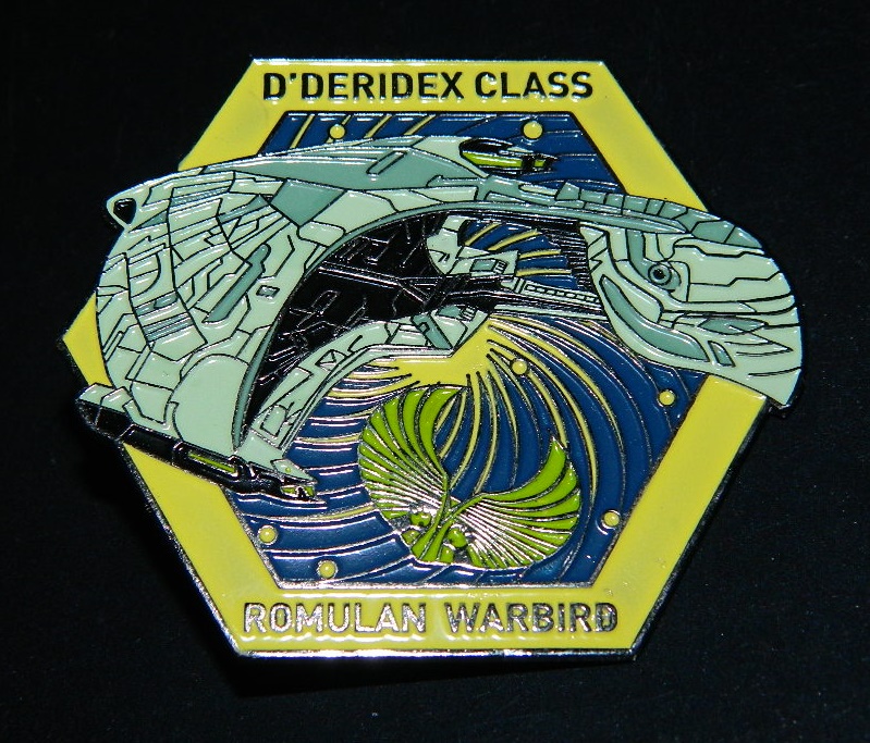 This 2.25″ wide by 2″ tall enamel metal pin features the image of the D’Deridex Class Romulan Warbird Starship as first seen on the Star Trek: The Next Generation TV series. This is a mint, never used licensed pin that comes in a sealed package with a header card. This pin is not easily found outside of Star Trek conventions due to low distribution. It is stored in a smoke and pet free environment.