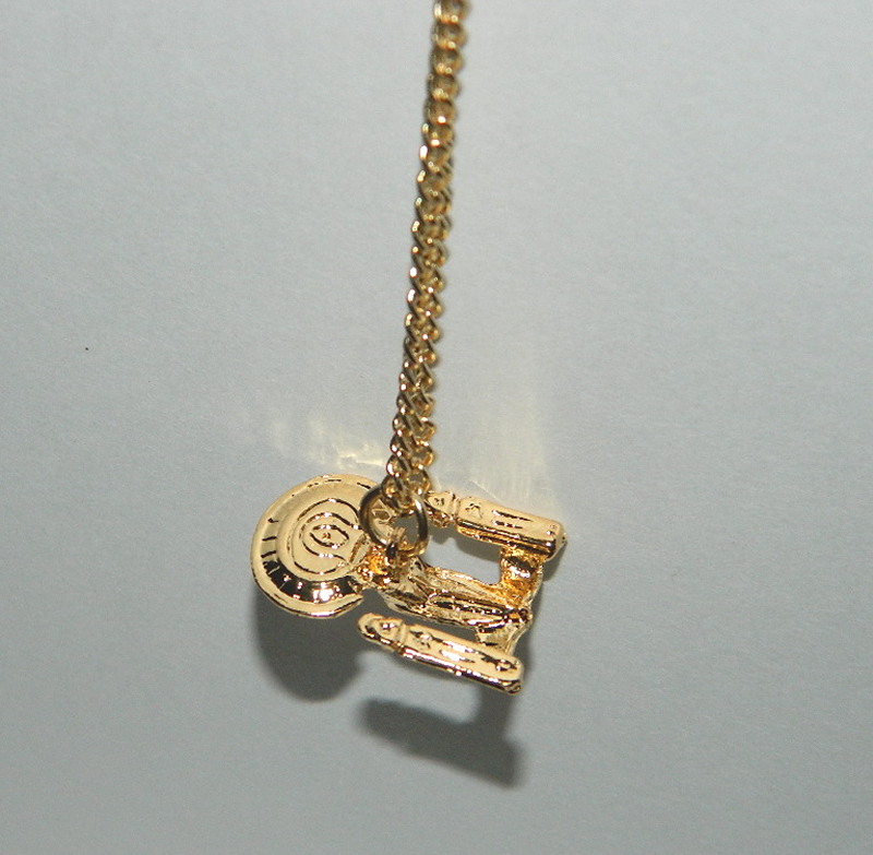 This is a necklace with a 24″ chain, in gold toned color, in the shape of the Star Trek: The Next Generation U.S.S. Enterprice NCC-1701-D. It measures 1″ long and is a mint, unworn necklace. Produced by Lincoln Enterprises, Majel Barrett Rodenberry’s company (Nurse Chappell and Gene’s widow) many years ago, this has had limited release and is not easily found outside of Star Trek conventions and fantasy shops. It has been stored in a smoke and pet free environment.