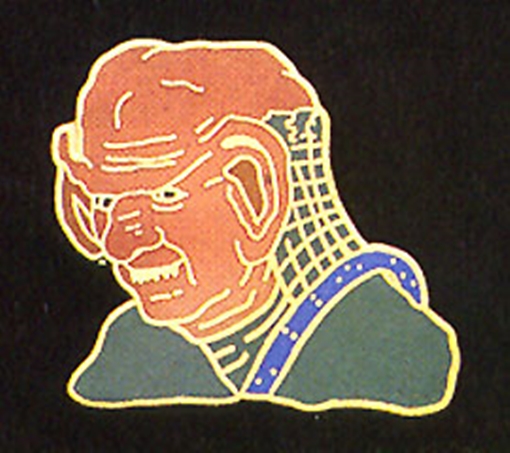 This 1″ high cloisonne metal pin features the head and shoulders of a Ferengi as first seen in the episode “The Last Outpost” on the Star Trek: The Next Generation TV series. This is a near mint pin, never worn or used, made by the Hollywood Pins Company in 1991, and now out of production. It has had limited release and is not easily found outside of Star Trek conventions. Hollywood Pins closed down in October 2001 so this pin is next to impossible to find. It is stored in a smoke and pet free environment.
