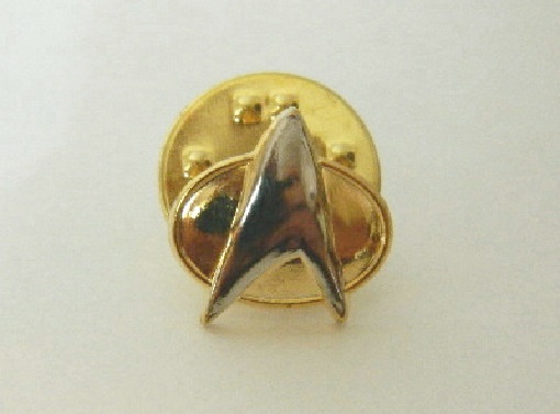 This .563″ metal cloisonne pin is a 1/4 size reproduction of the communicator pins worn by Starfleet on the hit series, Star Trek: The Next Generation. This is a new, unused, mint condition pin made by the Hollywood Pins Company. It has had limited release and is not easily found outside of Star Trek conventions. Hollywood Pins closed down in October 2001 so this pin will soon be next to impossible to find. It has been stored in a smoke and pet free environment.