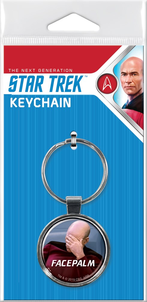 This is a 1.375″ wide colored metal key chain that features a photo image of Captain Picard doing a “Face Palm” from the Star Trek: The Next Generation TV series. This is a mint, unused key chain stored in a smoke and pet free environment.