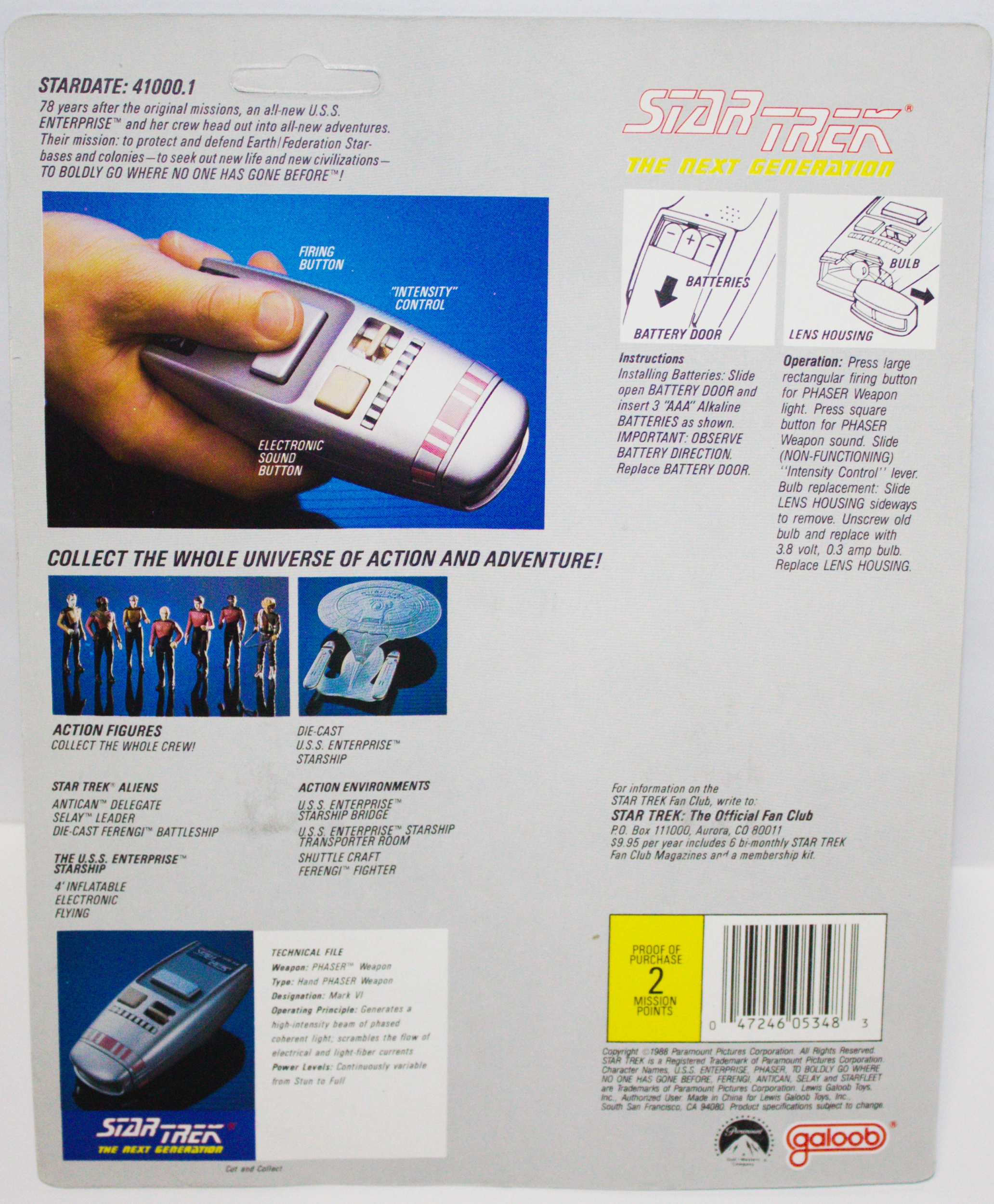 Galoob was the first company to make Star Trek: The Next Generation toys. This phaser was made in 1988, and had “very” limited distribution, as many stores had dropped the Galoob line by the time this came out. It is a very difficult toy to find. This is still mint in the blister, which has not discolored, on a near mint card. We pulled this straight from an unopened case we bought directly from Galoob in 1988. We are selling this as a collectible and make no guarantees other than as described. It is stored in a smoke and pet free environment.