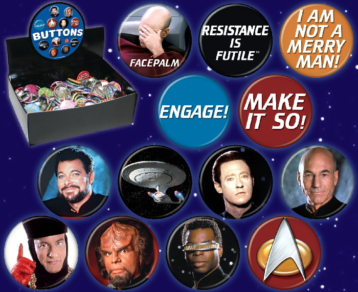 Produced by ATA-BOY, this is a licensed set of 144, 1.25″ wide metal buttons featuring multiple photo images from the Star Trek: The Next Generation TV series. This is a new, never used, assortment that comes in an illustrated display box and is stored in a smoke and pet free environment.