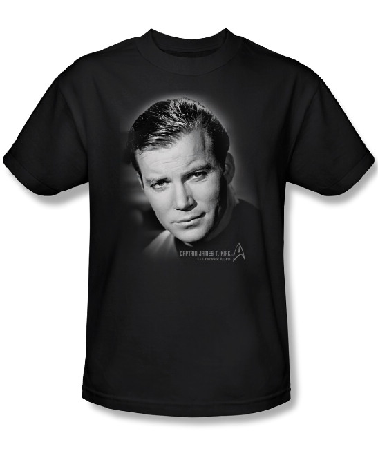 This is a black t-shirt featuring the image of Captain Kirk’s portrait from the classic original Star Trek TV series. This is a 100% cotton design, new, never worn shirt. It has been stored in a smoke and pet free environment.