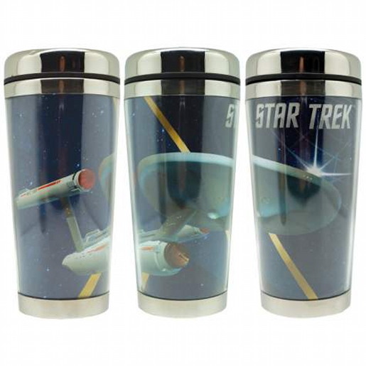 This is a full color, 7” tall, metal, 16 ounce travel mug featuring the NCC-1701 Enterprise from the Classic original Star Trek TV series. This mug is new and unused with a photo quality design. It has been stored in a smoke and pet free environment.