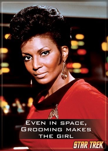 Produced by ATA BOY this is a licensed refrigerator magnet measuring 2.5″ by 3.5″ that features the image of Uhura with the words “Even in space, grooming makes the girl” from the classic Star Trek original TV series. This is a new, never used, magnet stored in a smoke and pet free environment.