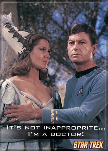Produced by ATA BOY this is a licensed magnet measuring 2.5″ by 3.5″ that features the image of McCoy with the caption “It’s not inappropriate I’m a Doctor” from Star Trek: The Original Series. We know that the word “inapproprite” on the magnet is misspelled and this is an error from the company who produced it. We do not know at this time if they are going to make a correction of the magnet, if they do this magnet could become a rare item. This is a new, never used, magnet stored in a smoke and pet free environment.