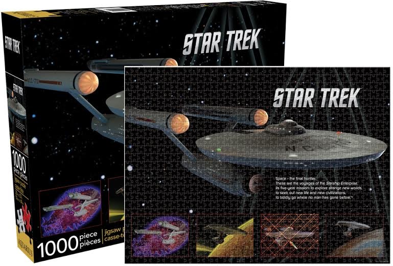 This is an unused, mint in the box 1000 piece jigsaw puzzle reproducing the image of the NCC-1701 Enterprise as seen in the famous TV show Star Trek: The Original Series. Produced in 2014 by Aquarius, it is stock #65239, and measures 20″ x 27″ when completed. It is stored in a smoke and pet free environment.