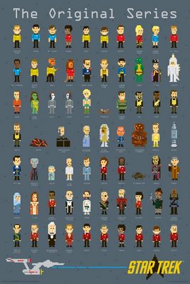 Printed in 2014 by NMR, this 24” x 36” poster depicts pixelated character images of the cast from the Classic Star Trek: The Original Series. This poster is a new, unused copy that comes rolled and is shipped in a protective tube. It has been stored in a smoke and pet free environment.