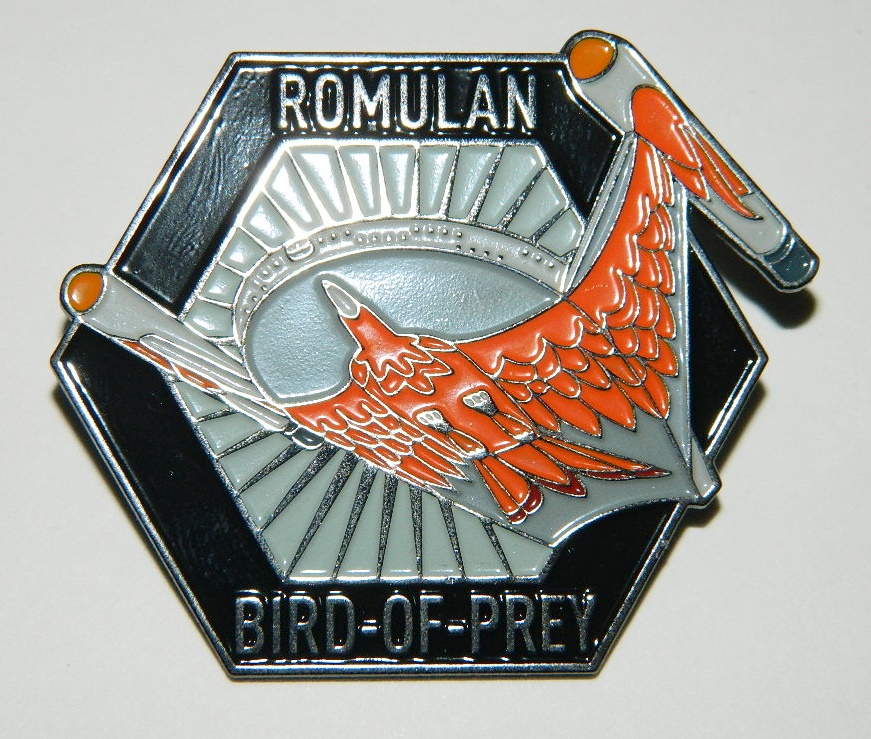 This 2.25″ wide by 2″ tall enamel metal pin features the image of the Romulan Bird-of-Prey Starship as first seen on the original classic Star Trek TV series.. This is a mint, never used licensed pin that comes in a sealed package with a header card. This pin is not easily found outside of Star Trek conventions due to low distribution. It is stored in a smoke and pet free environment.