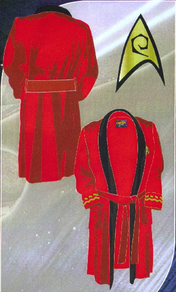 This is a red colored terry cloth bathrobe designed to resemble the engineering shirt worn by Mr. Scott (Scotty) on the classic original Star Trek TV series. It features an embroidered engineering logo over the left breast, officers braid on the end of the sleeves and comes in a sealed bag. It has two front pockets and a sash belt. This is a new, unused robe that will fit an average sized adult and has been stored in a smoke and pet free environment.