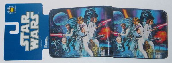This is black bi-fold leather wallet featuring the classic poster image from A New Hope on each side. It is a new, unused wallet, sealed in a plastic protector.