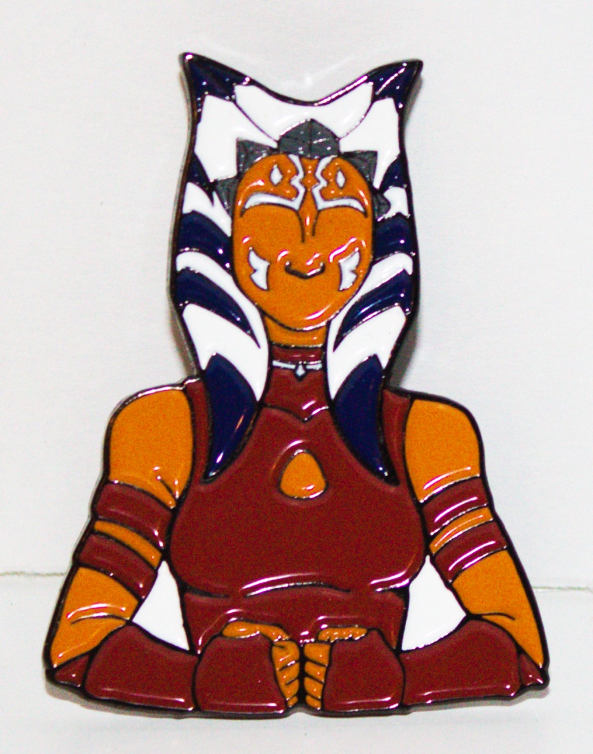 This new, unused embossed metal pin features the image of the Jedi Ahsoka Tano with her fist clenched as seen in various Star Wars TV series. It measures 2″ high x 1.55″ wide at the base, has been stored in a smoke and pet free environment and comes with two clutch back pins for attachment.